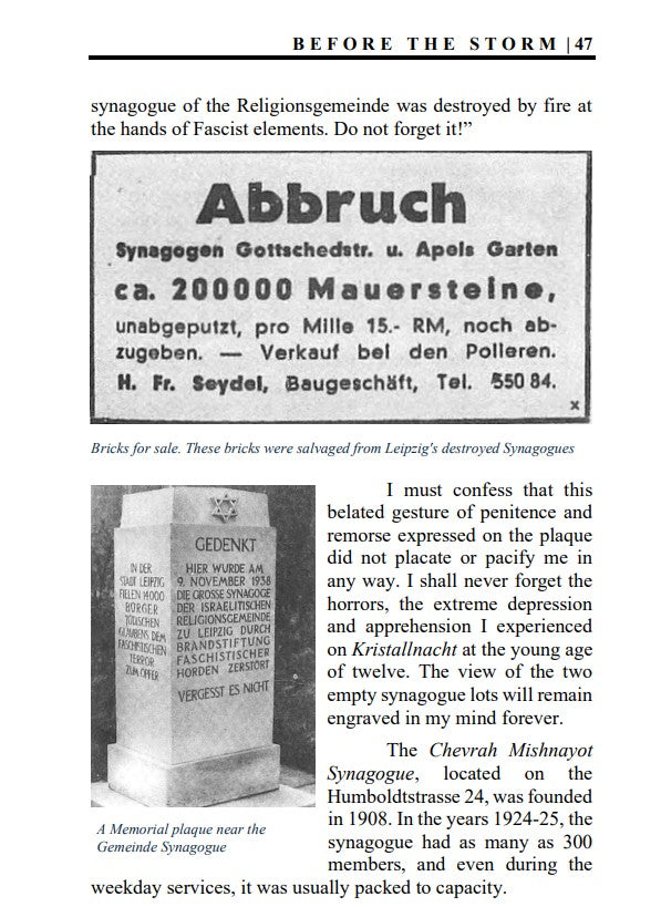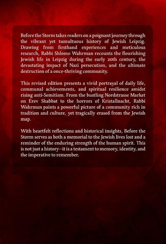 With photographs and a glossary of terms, "Before the Storm" is an accessible for anyone interested in Jewish history, particularly the era before the Holocaust. Rabbi Shlomo Wahrman's firsthand experiences and thorough research make this book a valuable resource for understanding the rich cultural heritage of the Jewish community in Leipzig and the profound losses they endured.